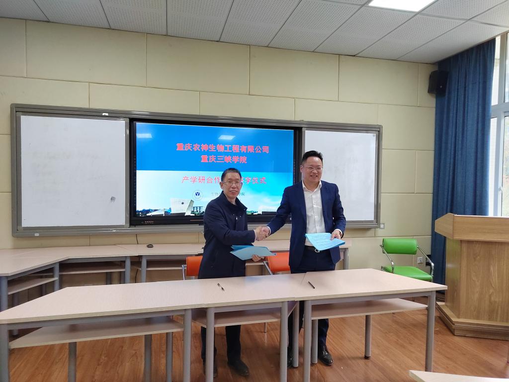 2022年11月4日,我院与重庆农神生物工程有限公司签署了产学研合作协议和技术合作协议,重庆农神生物工程有限公司总裁马金平、副总裁王强、蒋高、陈明元、总裁助理梅量和我院院长肖国生、党总支书记骆孟鑫、副院长汪开拓、党政办公室副主任李华林出席了签约仪式。