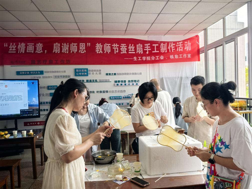 9月10日下午,由2138cc太阳集团主办,学院分工会、植愈工作室承办的“蚕丝扇手工制作”教师节庆祝活动在慎思楼2栋3楼植愈工作坊举行,学院部分教师积极参与,度过了一个充满创意与感恩的教师节。