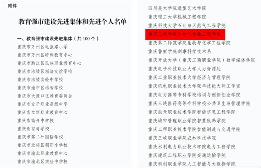 9月22日,重庆市人力资源和社会保障局、重庆市教育委员会联合发布教育强市建设先进集体和先进个人表彰名单,全市100个单位和300名个人受到表彰。我院被评为“教育强市建设先进集体”荣誉称号。