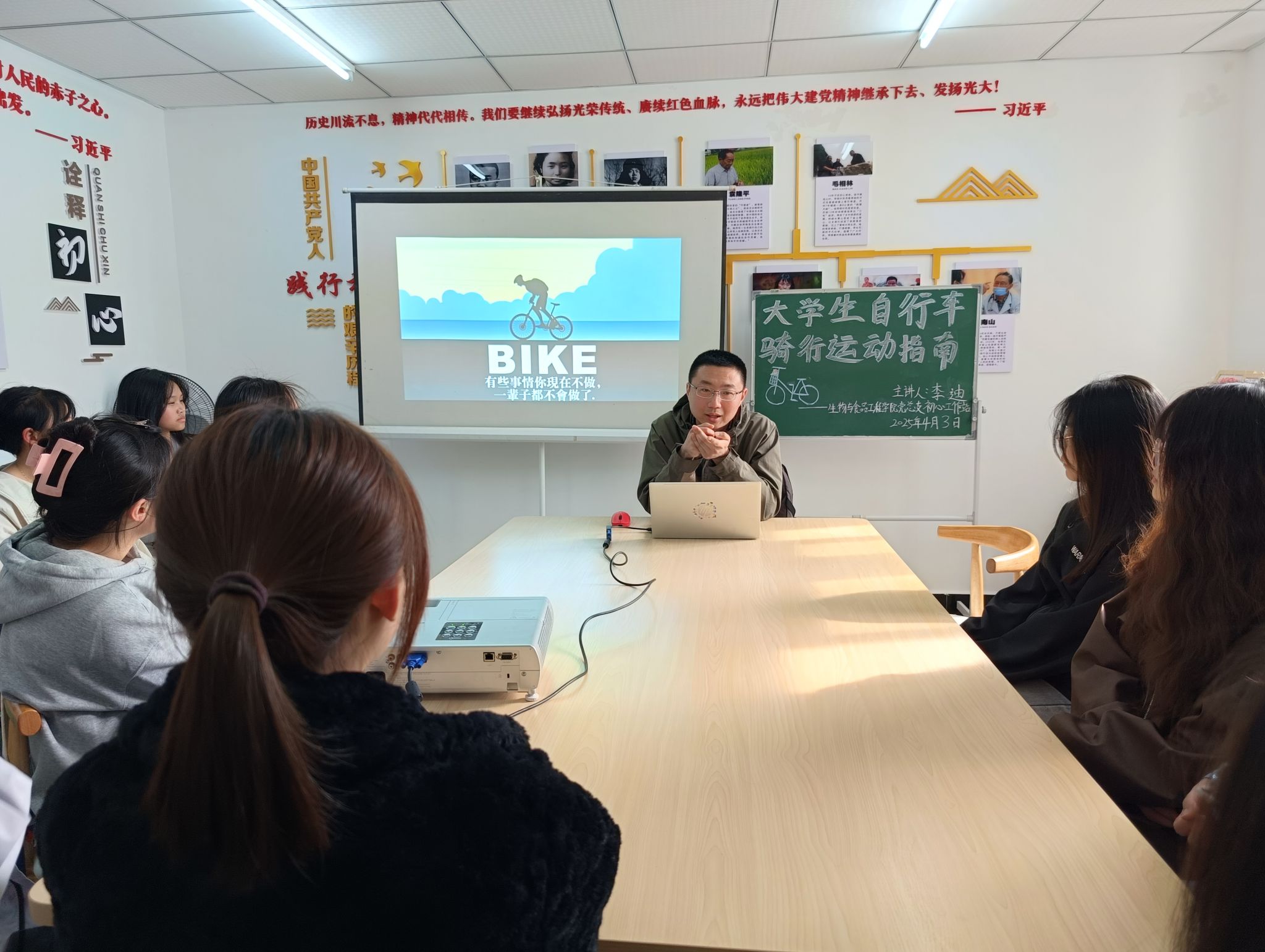 为丰富大学生的课余生活,以及增强同学们挑战自我的勇气,4月3日15:00,我院初心工作站于蓝雾苑2舍4楼活动室开展第48期“寝室工作日”活动,李迪老师围绕骑行运动向同学们展开分享,共计19人参加。