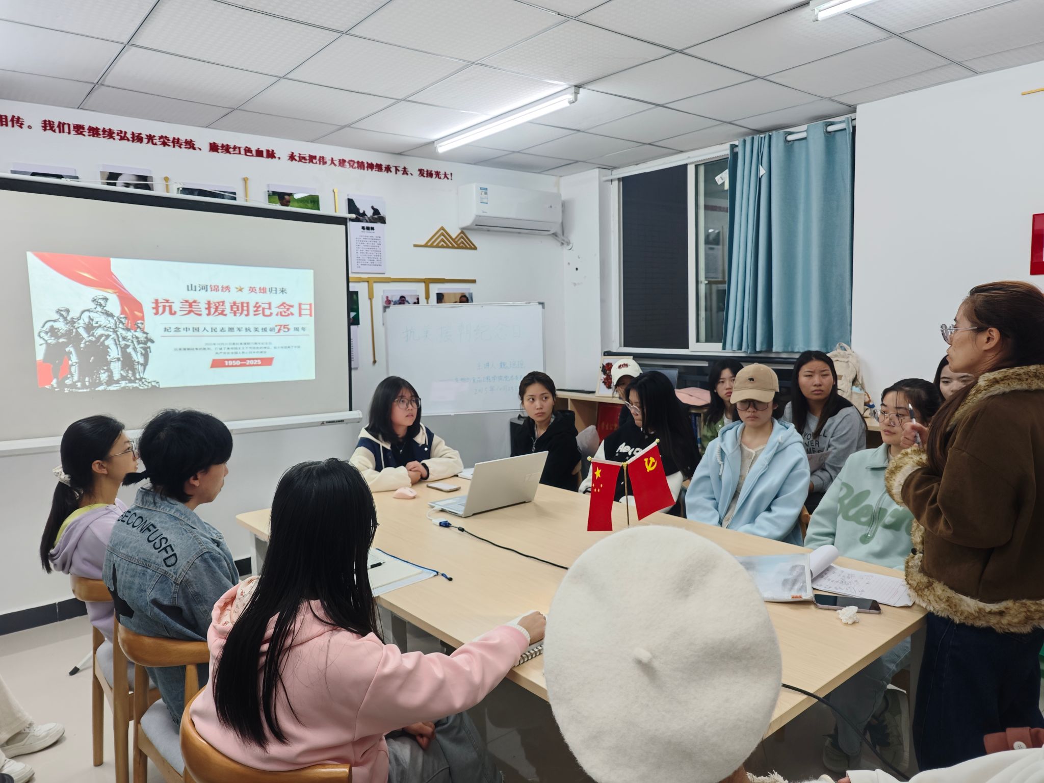 10月25日20:00,我院初心工作站在蓝雾苑2舍4楼活动室开展第18期“主题教育”活动,魏瑶瑶同学带领大家学习抗美援朝纪念日,共计21人参加。