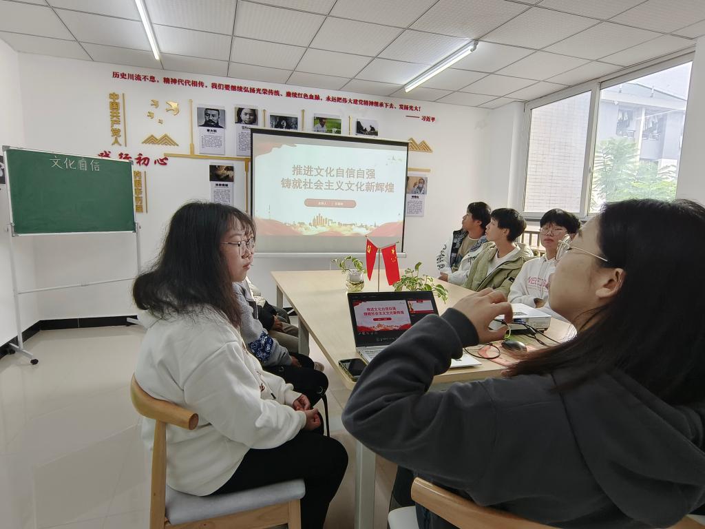 活动伊始,许美琳老师以大学生活应该如何度过来破冰,引起同学们的学习兴趣,接着分别从建设具有强大凝聚力和引领力的社会主义意识形态、广泛践行社会主义核心价值观、提高全社会文明程度、繁荣发展文化事业和文化产业、增强中华文明传播力影响力等5个方面讲述如何推进文化自信自强,引导学生努力学习、网络谨慎发言、积极向身边同学宣扬中华优秀文化。学习结束后,同学们积极参与讨论,分享自己的学习心得。