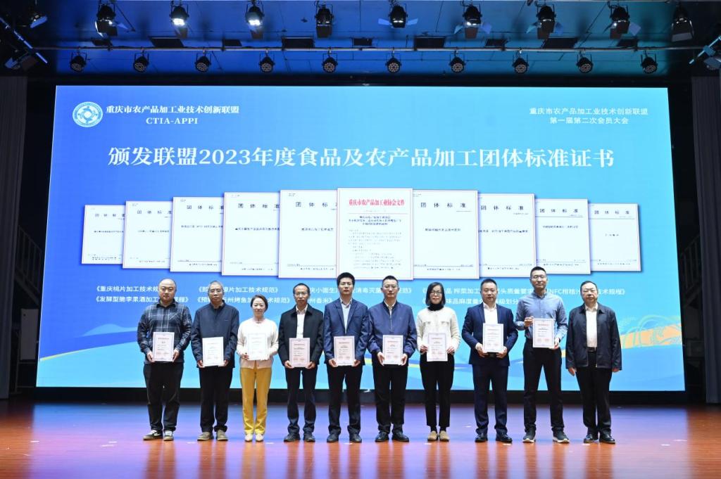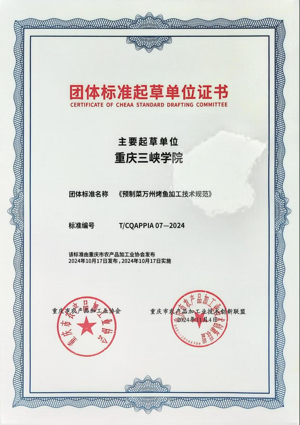 11月4日,重庆市农产品加工业技术创新联盟第一届第二次会员大会召开。会议上,重庆市农产品加工技术创新联盟为我院牵头制定的《预制菜万州烤鱼加工技术规范》团体标准颁发了证书。