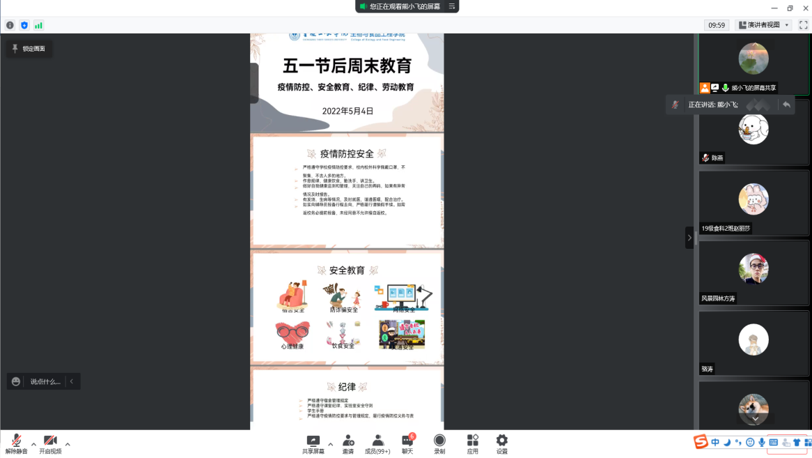 5月4日,为做好五一假期学生收心工作,落实疫情防控常态化下学生管理要求,提升我院学生遵纪守法意识,我院学工办全体辅导员分年级召开五一收假线上专题教育会议。