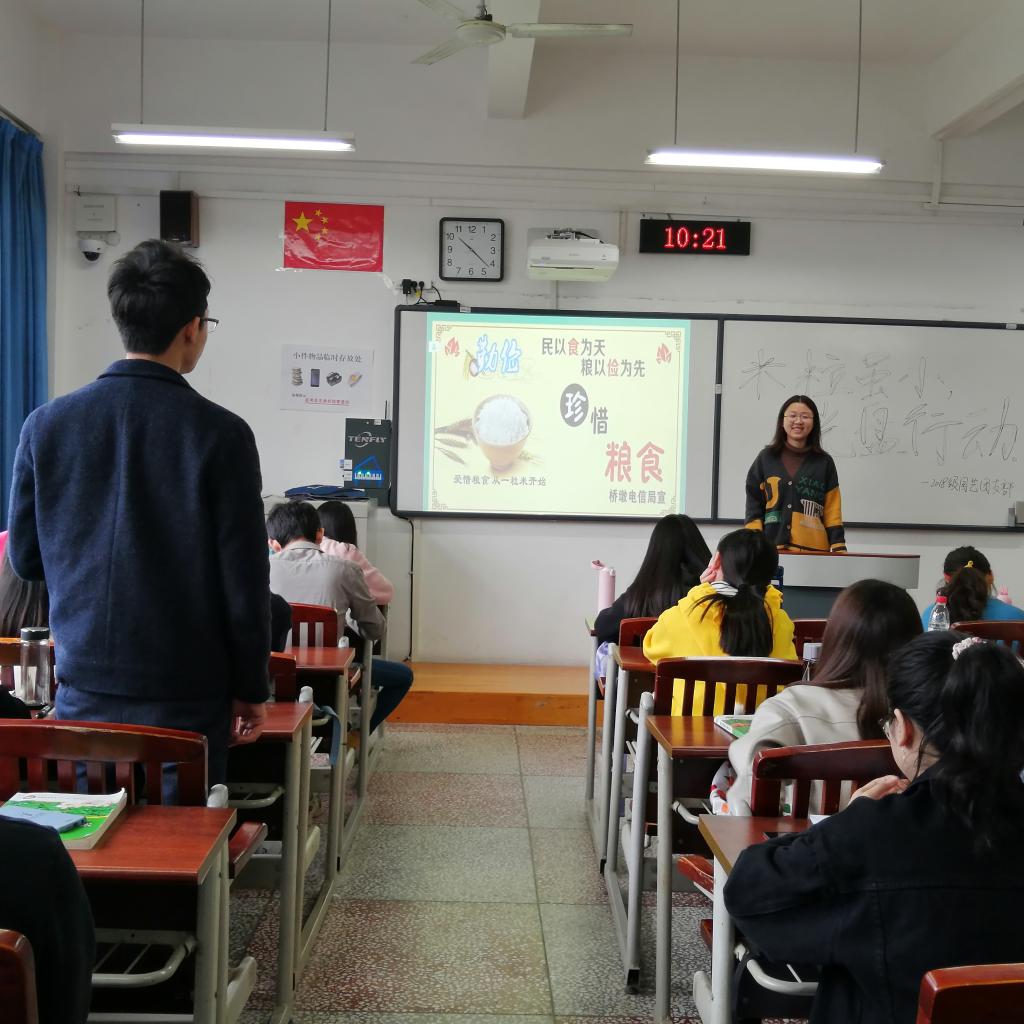 10月13日-18日,我院2018、2019、2020级各班组织同学们在教室开展“节约粮食,光盘行动”主题班会,本次活动旨在让同学们弘扬中华民族勤俭节约的传统美德,树立节约光荣、浪费可耻的意识,学会文明就餐,参与光盘行动。