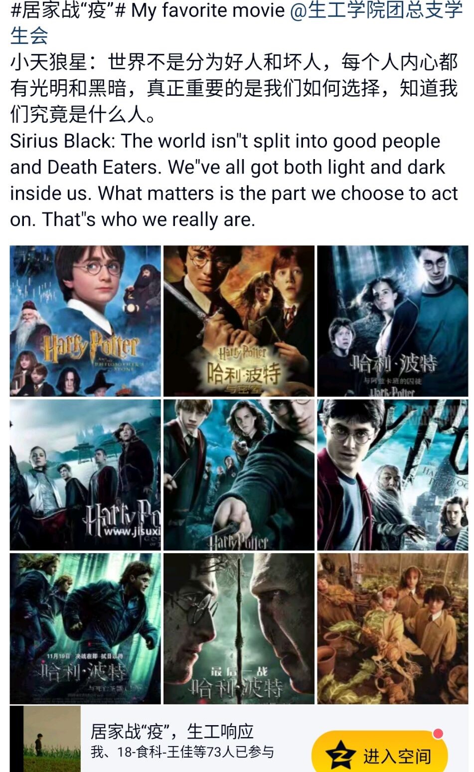 “汇聚青春正能量,同心战‘疫’显担当”。我院积极响应国家的号召,开展“居家战‘疫’,生工响应”线上打卡活动,我院同学积极参与其中。本次打卡活动旨在丰富居家生活的同时,拓宽同学们的知识面,通过线上打卡互动,分享电影,感受居家陪伴家人的温情。