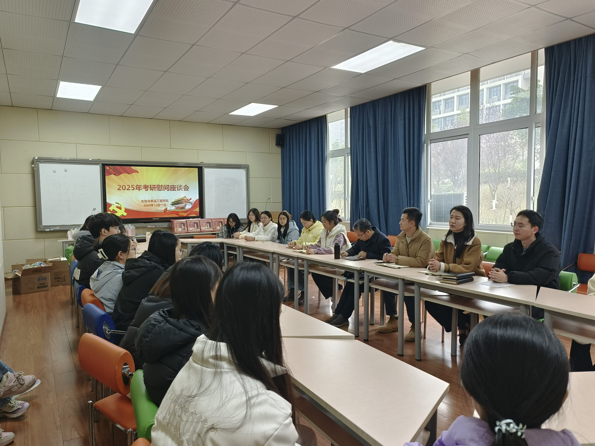 为鼓励考研学子,缓解备考压力,我院于12月17日上午在慎思楼2-216教室开展2026届考研学子慰问活动。党总支书记肖国生、全体辅导员及考研学生代表参加。