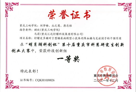 2021年12月,由重庆市教育委员会主办,重庆大学承办的“明月湖科创杯”第十届重庆市科慧研究生创新创业大赛在重庆大学圆满落幕。我院食品加工与安全研究生刘梦雅、丛之慧和蒋忠桂团队参赛项目“柠檬皮多糖对2型糖尿病模型小鼠体内降血糖与炎症因子的干预作用”荣获科技创新组一等奖,顾欣副教授荣获“优秀指导教师奖”。