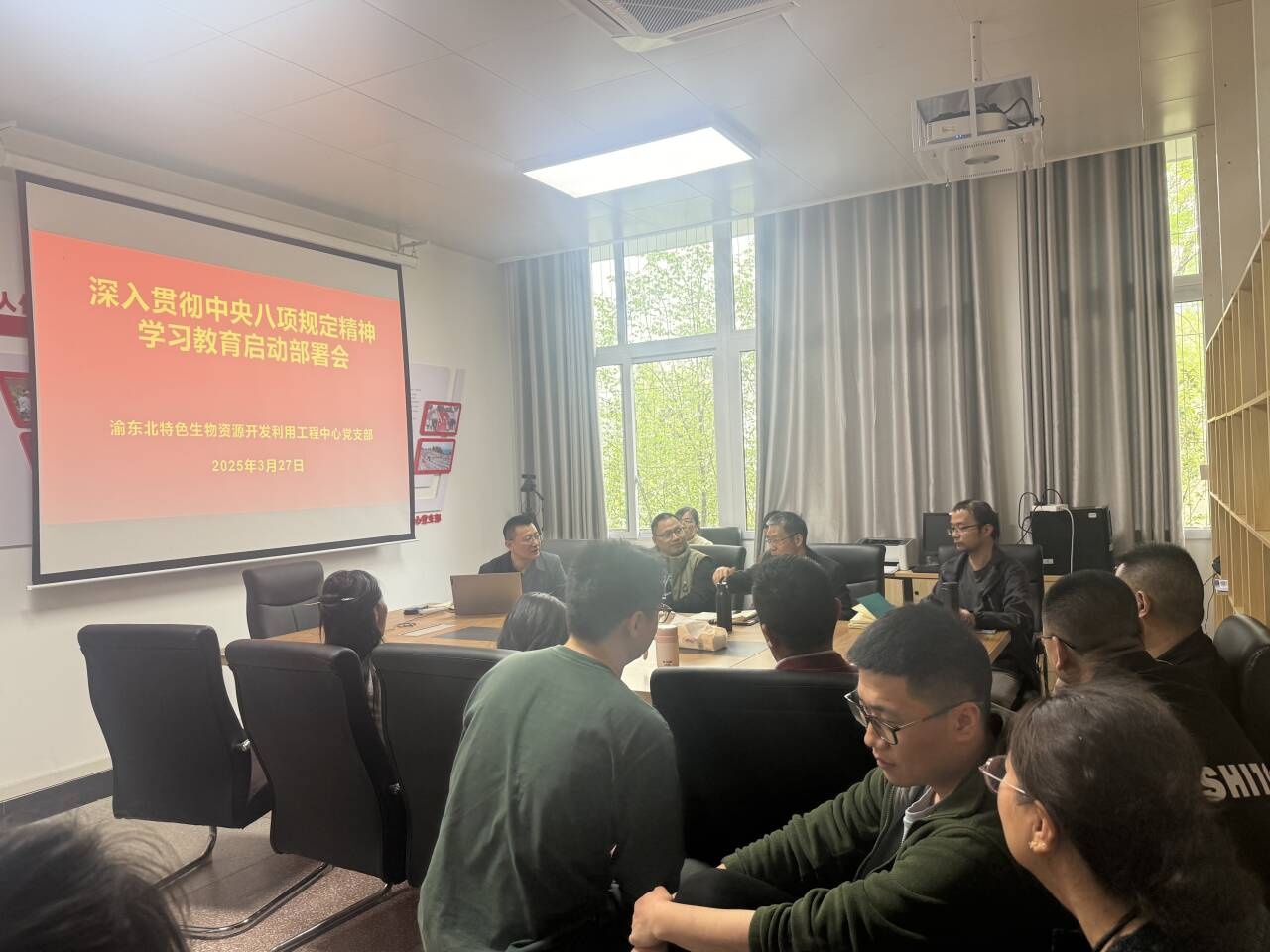 2025年3月27日,渝东北特色生物资源开发利用工程中心党支部在慎思2-217召开党员大会部署深入贯彻中央八项规定精神学习教育,党支部书记赵峰同志主持部署会并作学习动员讲话,指出要按照党中央、市教委、校党委和学院党总支的要求,扎实搞好此次学习教育活动。会议期间还研讨了“样板支部”建设工作,党支部党员肖国生、甘丽萍等同志就本学期党员学习活动提出建议,其余与会党员热烈讨论。