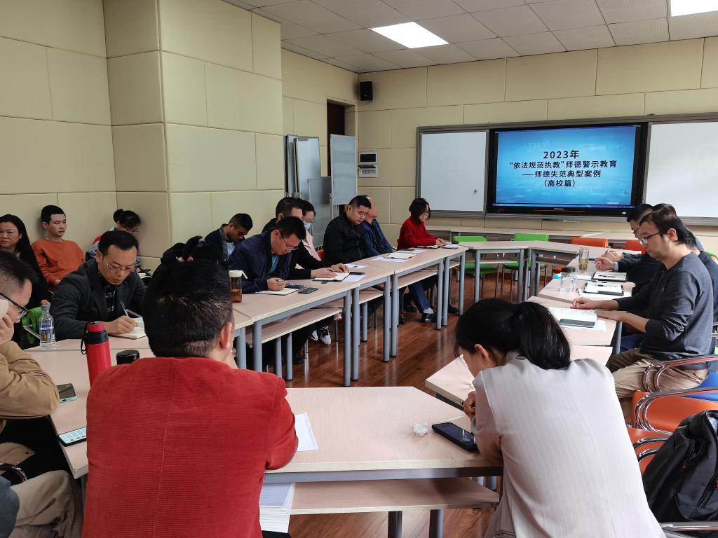 会上,骆孟鑫通报了教育部公开曝光的第十一批、第十二批违反教师职业行为十项准则的典型案例;院长肖国生、党总支副书记陈文剑、副院长汪开拓、纪检委员陈国维分别围绕典型案例“以案说法”,“以案说德”,“以案说责”,“以案说纪”。