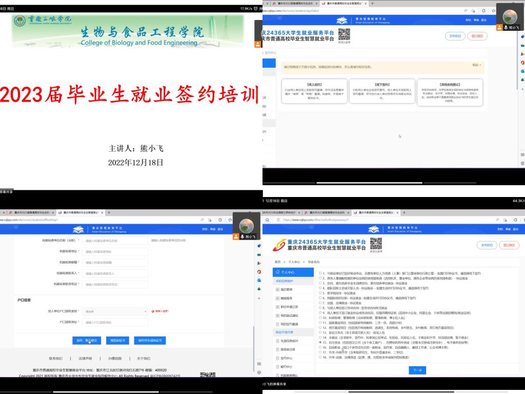 本学期已接近尾声,伴随着同学们实习任务结束之际和寒假离校返乡之际,为继续做好同学们的就业指导和服务工作,12月18日下午,我院于腾讯会议线上召开了2023届毕业生就业签约培训,会议由熊小飞主持,2023届毕业生参会。