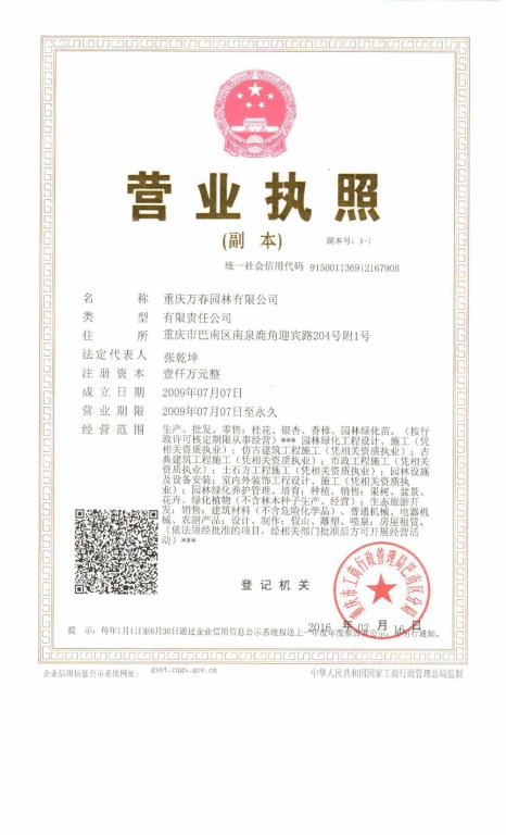 重庆万春园林有限公司成立于2009年,注册资金1000万元人民币,是一家集园林景观设计与施工、园林绿地养护、植物生产、销售为一体的综合性园林公司。